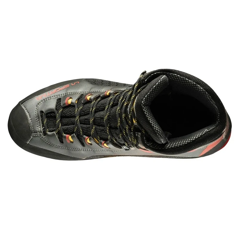 The uppers are made with the exclusive high tenacity fabric with differentiated abrasion resistant zones and Honey-Comb Guardâ„¢ reinforcements positioned in the areas most subject to abrasion. The aesthetic Trango line with seams minimized achieves the reduction of weight, also contributing to this is the Vibram sole with the exclusive La Sportiva Cube design with lightened thicknesses. The Gore-Tex Performance Comfort membrane guarantees water resistance and breathability. The 3D-Flex System allows for better control on holds. The differentiated lacing system between the upper and the lower part of the boot allows for perfect adjustment of volume for optimal wearing comfort. The Trango series is enriched with increasingly technical and aesthetic contents in advance of its time.