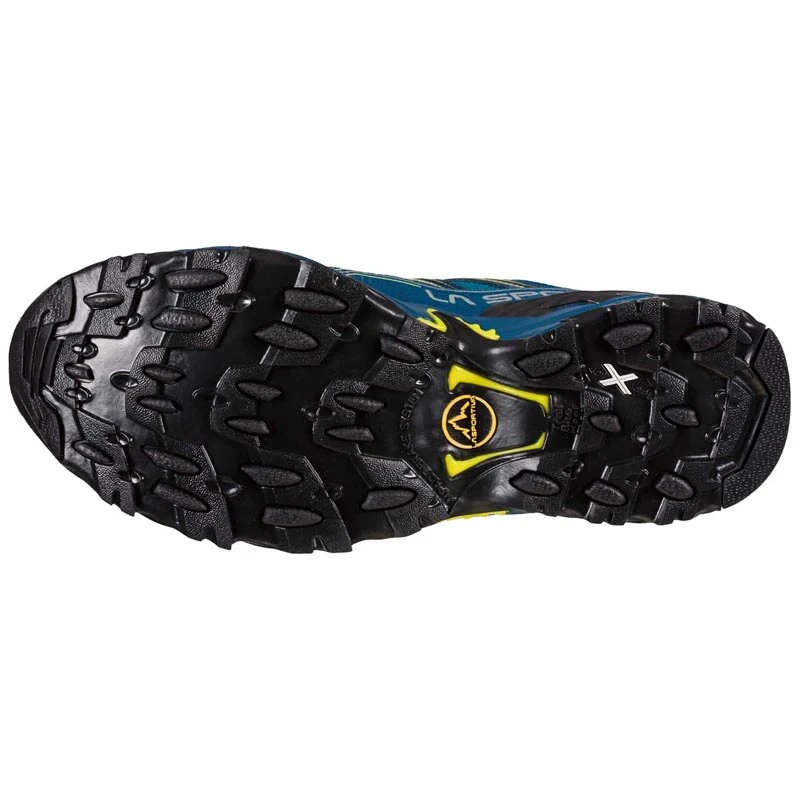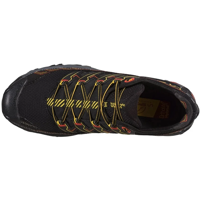 The La Sportiva Ultra Raptor II’s upper uses highly breathable air-mesh fabric and is assembled by integrating a shock-absorbing Endurance Platform in soft EVA with differentiated thickness (greater at the toe, lower at the heel) for excellent impact absorption in any situation and reduction of the ramp -angle. The rear stabilizing heel allows perfect control on traverses. The lacing system is integrated with the upper by means of loops sewn on the internal elastic fabric and with high-frequency reinforcements on the external mesh: this system allows you to distribute the tension of the lacing over the entire upper and wrap the foot in the best possible way for a perfect wearing comfort. Ortholite® Hybrid laces and footbed are also made from recycled materials.