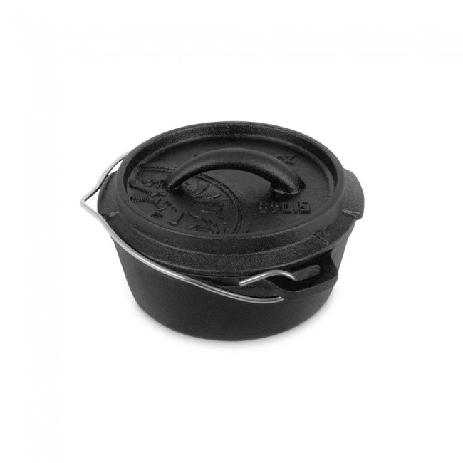 Thanks to the amazing characteristics of cast iron and the special structure of the surface, warmth is efficiently stored and distributed. The pre-treated surface (seasoned finish) makes a first seasoning unnecessary, and the sturdy Dutch oven can be used right away. In the open air, it is used on an open fire or with charcoal and briquettes. The raised edge of the lid makes it possible to place embers or charcoal also on the Dutch oven. The Dutch oven is thus heated from all sides and is for example suitable for baking bread.